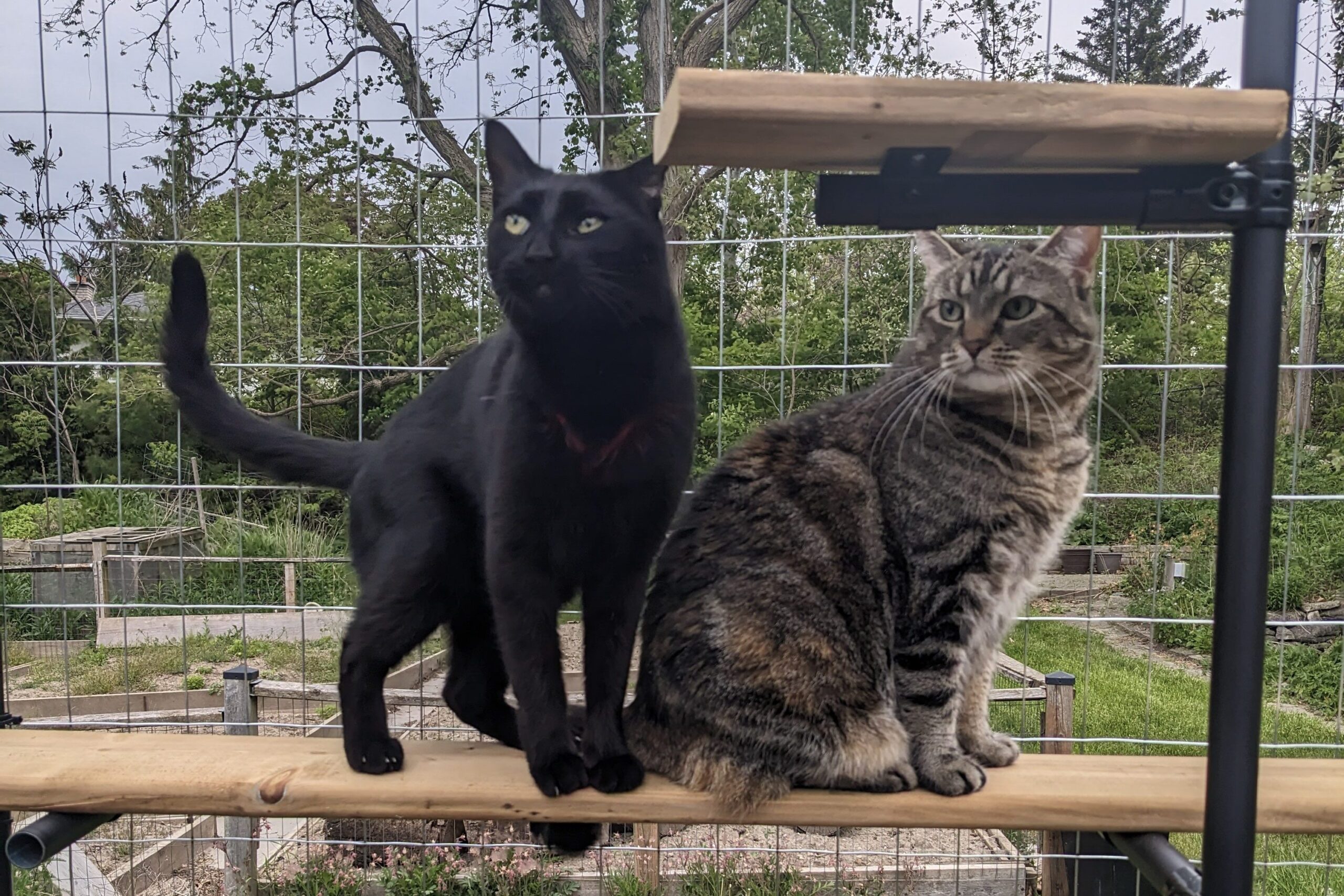 Cats enjoying sunshine in a catio by Mhairi McFarlane.